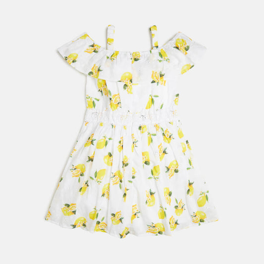 Girls Lemon Print Sangallo Off Shoulder Lemon Dress