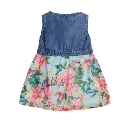 Girls Multi & Blue Mixed Fabric Dress With Flower Pattern