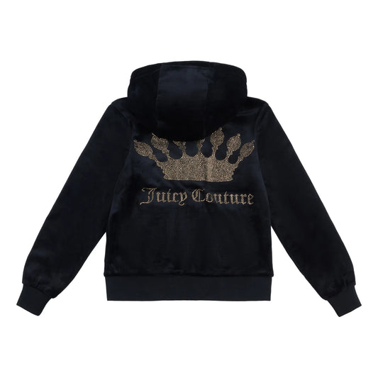 Girls Black Luxe Crown Diamante Velour Zip Thru Hoodie